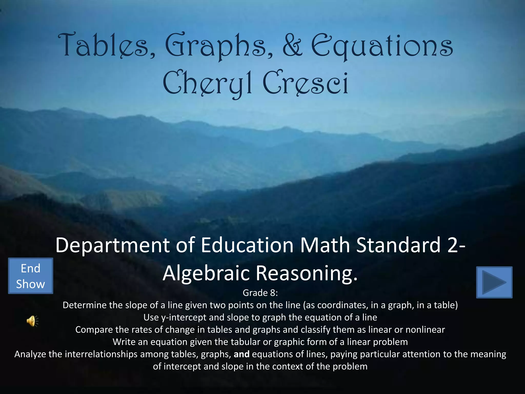 This document provides information about key concepts related to analyzing relationships between tables, graphs, and equations. It discusses how to determine slope from two points on a line graph or in a table, how to identify the y-intercept and x-intercept of a line graph, and how to write the equation of a line given its slope and a point. Examples are provided to illustrate how to convert between tabular, graphical, and equation forms of linear relationships. Connections between these representations are emphasized.
