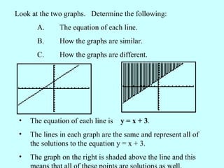This document provides instructions for graphing systems of linear inequalities. It explains how to write inequalities in slope-intercept form, plot points to draw the line, and shade the appropriate region based on whether it is <, ≤, >, or ≥. An example problem is worked through step-by-step to demonstrate how to graph two inequalities and find the overlapping region that satisfies both inequalities. Practice problems are then provided for the reader to work through on their own.
