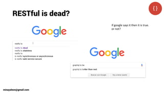 The document discusses RESTful APIs and GraphQL. It notes criticisms of RESTful APIs like requiring multiple requests to fetch related data and being rigid. GraphQL is presented as an alternative with features like strong typing and fetching related data in one request. The document also discusses evolving APIs through use of hypermedia, shared vocabularies, and adhering to REST principles like using nouns for resources and HTTP verbs for actions. Evolvable APIs are said to use these techniques to avoid breaking changes.