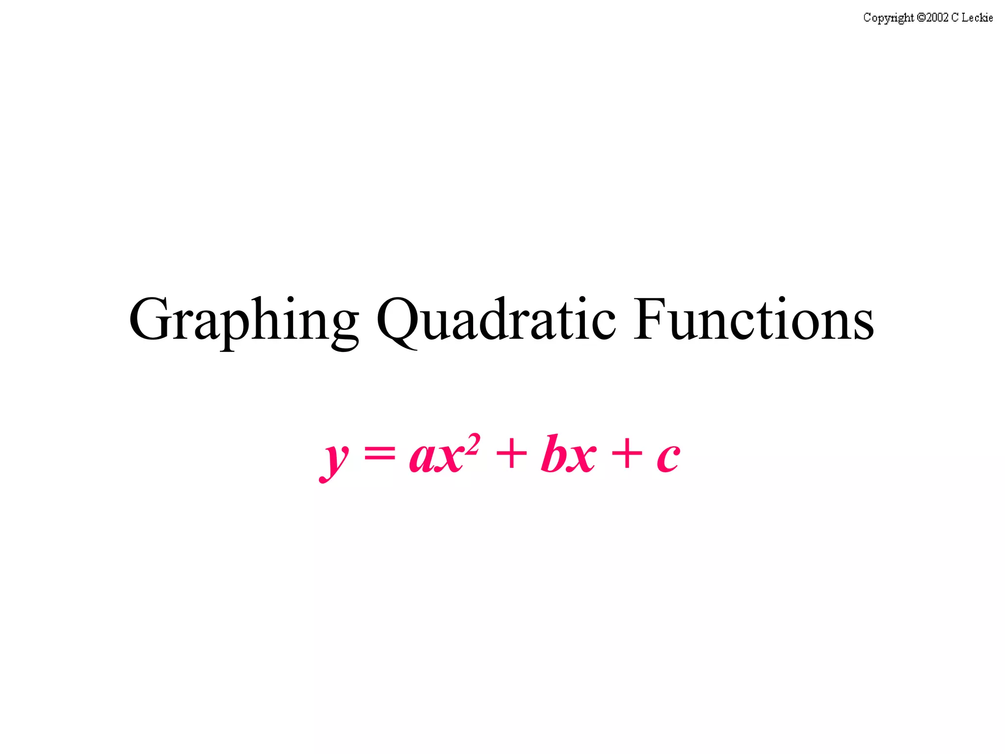 The document provides information about graphing quadratic functions in standard form (y=ax^2 + bx + c). It discusses that the graph is a parabola that opens up or down depending on whether a is positive or negative. It also explains that the line of symmetry for the parabola is given by x=-b/2a and the vertex is found by plugging the x-value from the line of symmetry into the original equation. Finally, it demonstrates graphing a quadratic function in standard form using three steps: finding the line of symmetry, finding the vertex, and finding/reflecting two other points to connect with a smooth curve.