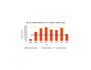 The document presents statistical data on cervico-vaginal cytologies from 2008 to 2015, detailing absolute frequencies and standard deviation ranges for different categories such as ASC-US and SIL. It also includes ratios and percentages of ASC-US/SIL over the same period, demonstrating trends and variations in cytological findings. Overall, the data reflects changes in frequency and categorization of cervical cytologies across the specified years.