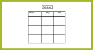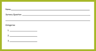 Decide a list of possible survey questions to collect data on. (Ex. favorite