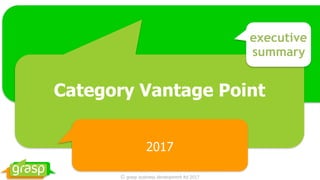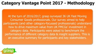The Category Vantage Point 2017 report summarizes a survey of 36 UK fast-moving consumer goods professionals aimed at evaluating category data suppliers to enhance the value derived from category data investments. The findings indicate that Kantar remains the primary data currency in the market, but competitors like Dunnhumby and I2C are gaining traction, with data quality being the top priority for respondents. Recommendations suggest improving client relationships and understanding while addressing significant challenges in data integration and service delivery.