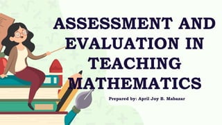 The document outlines the assessment and evaluation framework for teaching mathematics, focusing on the GRASP model which includes elements like goal, role, audience, situation, product, and standard for project-based assessments. It highlights various authentic assessment tools, including checklists and interviews, that aid in evaluating student performance and problem-solving skills in mathematics. Additionally, it emphasizes the importance of understanding student perspectives through interviews to enhance learning and address difficulties.
