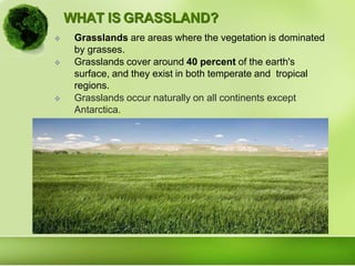 Grasslands are areas dominated by grasses that cover 40% of the Earth's surface. A grassland ecosystem consists of primarily grasses as well as animals and microorganisms. The two main types are tropical grasslands near the equator and temperate grasslands at higher latitudes. Tropical grasslands have taller, coarser grasses and scattered trees while temperate grasslands have shorter, softer grasses. Grasslands support a variety of plant and animal life as producers, primary consumers, and higher-level consumers and decomposers. Threats include conversion to agriculture, urban development, and climate change, so conservation efforts focus on education, wetland protection, crop rotation, and controlled burning.