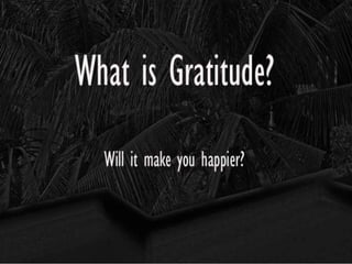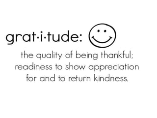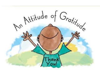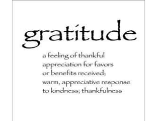 This document outlines an activity focused on cultivating gratitude. It begins with an opening prayer and discusses showing gratitude to God, parents, and neighbors. Participants are instructed to write a prayer of thanks to God, a letter of gratitude to parents, and thank you messages for neighbors. The document defines gratitude and discusses its relationship to prayer and thanksgiving. It closes with a sample prayer of gratitude and instructions to get envelopes for the neighbor activity.