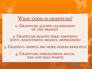 The document discusses the concept of gratitude, defining it as thankfulness, appreciation, or a feeling of acknowledgement for benefits received. It provides quotes about recognizing blessings rather than dwelling on what is lacking, and how entitlement can undermine relationships. The document encourages reflecting on things one is grateful for, explaining how gratitude makes us feel, and concludes with a prayer of thanksgiving.