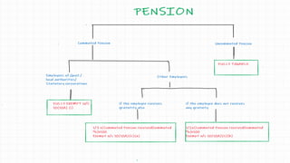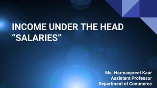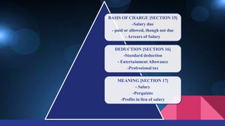 This document discusses the taxation of salary income in India. It defines salary broadly under section 17 to include monetary and non-monetary payments from employment. Salary is taxable either on a due or receipt basis, whichever is earlier. Allowances are generally taxable but some like House Rent Allowance and special allowances are partly exempt. Retirement benefits like gratuity and pension are taxable with certain exemptions. The key aspects covered are the scope and meaning of salary, deductions allowed, taxation of various employment-related payments and benefits, and important concepts around employer-employee relationships and place of accrual.