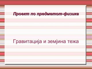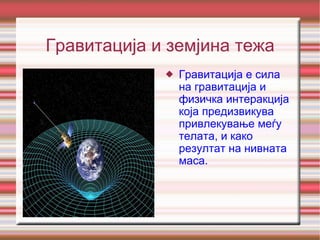 Гравитација и земјинатежа Гравитација е сила на гравитација и физичка интеракција која предизвикува привлекување меѓу телата, и како резултат на нивната маса.