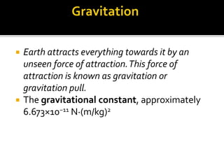 - Gravitation causes objects to fall freely under acceleration due to gravity (g) and explains motions like the moon around Earth and planets around the Sun.