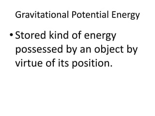Gravitational potential energy is the stored energy an object possesses due to its position in a gravitational field. The formula for gravitational potential energy is PE=mgh, where PE is the potential energy in joules, m is the object's mass in kilograms, g is the acceleration due to gravity (9.8 m/s^2), and h is the height of the object in meters. The document provides examples of using the formula to calculate the gravitational potential energy of a person climbing to the roof of a tall building, a rock being raised, and a leopard climbing a tree.