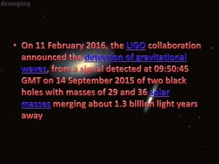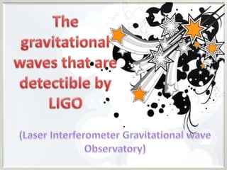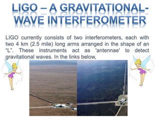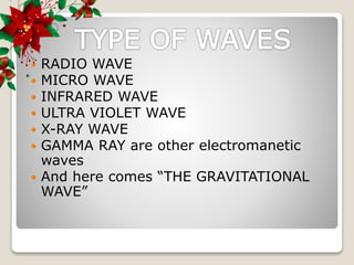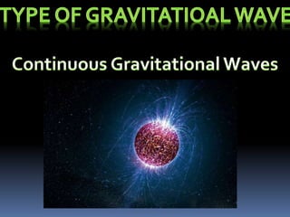 The document discusses gravitational waves as a phenomenon described by Einstein's theory of general relativity, highlighting their origin from events like supernovae and neutron star collisions. It outlines various detectors used to measure these waves, such as LIGO and Virgo, and notes their unique properties and implications for understanding the universe. Gravitational waves provide insight into high-density regions and serve as a confirmation of general relativity.