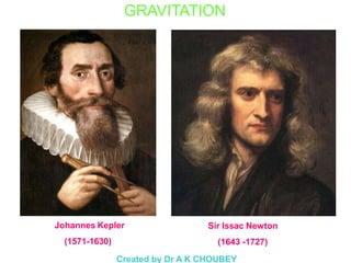 1. The document discusses concepts related to gravitation including Newton's universal law of gravitation, Kepler's laws of planetary motion, acceleration due to gravity, mass, weight, thrust, pressure, and equations of vertical motion.