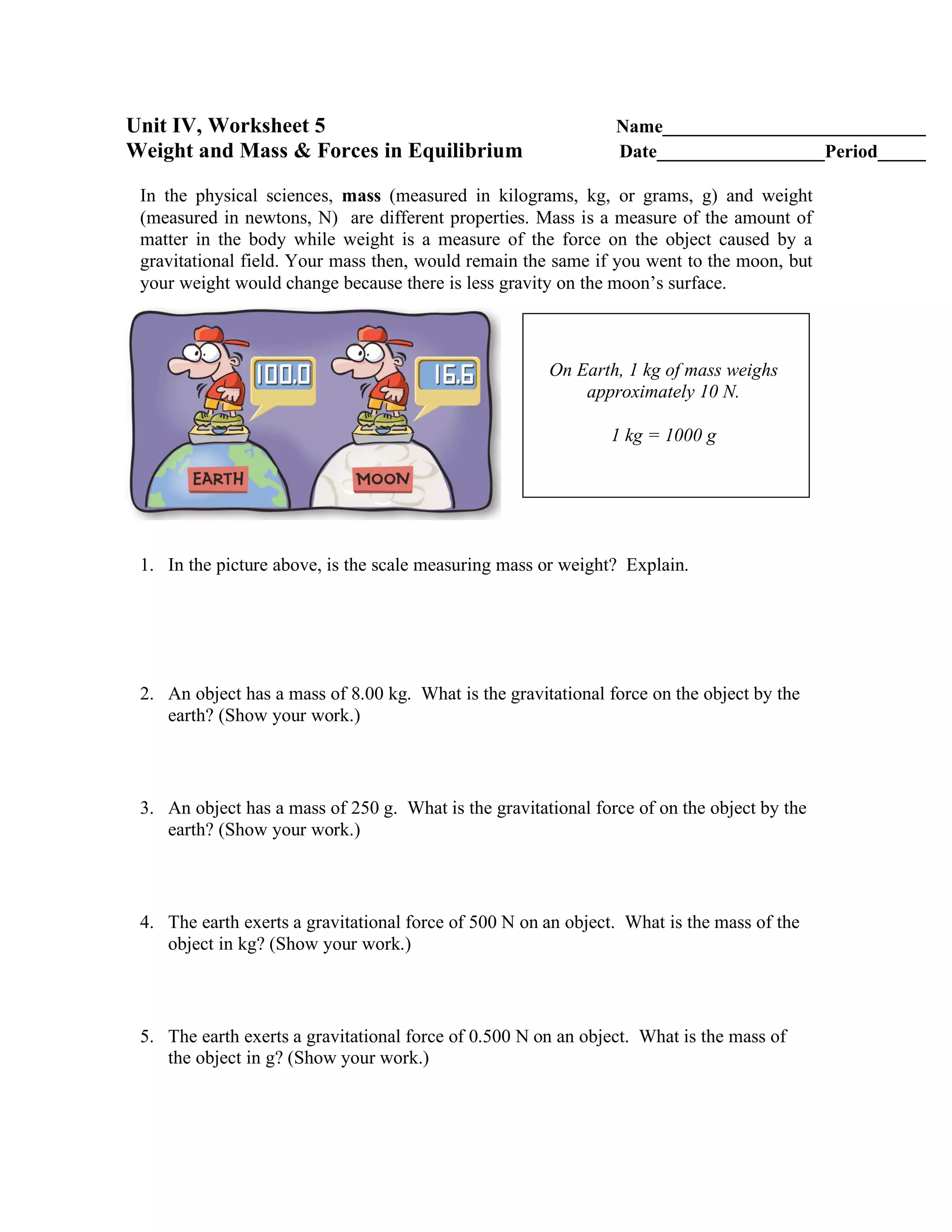 This document provides a worksheet on forces and equilibrium with 10 problems. It begins by explaining that mass is a measure of amount of matter while weight is the force caused by gravity, and one's mass would stay the same on the moon but weight would decrease due to lower gravity. It then provides problems involving calculating gravitational force based on given mass or finding mass based on given gravitational force. The remaining problems involve drawing force diagrams and using the concept of equilibrium to solve for unknown forces like tension or normal force.