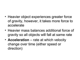 Galileo showed that all objects accelerate at the same rate when falling, due to gravity, regardless of their mass. Heavier objects experience a greater force of gravity but require more force to accelerate them, so the acceleration is the same. Acceleration is the rate of change of an object's velocity over time and is directly proportional to the net force acting on an object and inversely proportional to its mass, as stated in Newton's Second Law of Motion. Newton's Three Laws of Motion describe the relationship between an object's motion and the forces acting upon it.