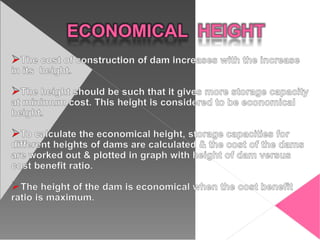 This document discusses the design and construction of gravity dams. It explains that gravity dams resist forces through their massive weight and have vertical or near-vertical faces. The key components, external forces, and methods of stress analysis are described. Failure can occur through sliding, overturning, cracking or crushing, so factors of safety are considered. Joints are used to aid construction and control cracking. High construction costs require stable foundations, but maintenance costs are lower with less water loss.