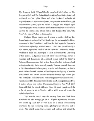 This interview summarizes Rodrigo Rey Rosa's background and writing process. It discusses how he was introduced to writing through traveling in Europe after high school. He lived in New York City and attended a writing workshop with Paul Bowles, who later translated and published his first short story collection. Rosa then moved to Tangier, Morocco where he lived cheaply and wrote extensively. His early works were more abstract and placeless, while later works like La orilla africana incorporated more specific place details through his observations. Rosa discusses how an unexpected plot development in that novel led him to create a new character's backstory to resolve the situation. He prefers writing short stories in one sitting once the story is fully formed