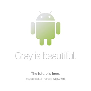 The document discusses design principles of Android KitKat 4.4, which uses a flat, gray interface to allow photos and content to stand out. By removing color from most interface elements and using it only for active elements, the interface feels simplified and user focus is on content. Shapes are used to provide clear cues for interaction. Color is then used strategically in specific contexts like popups to provide feedback to users. The simplified, content-focused design aims to improve visual communication and speed up the design process.