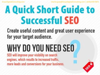 The document discusses effective SEO tactics, including producing high quality, shareable content to avoid Google penalties, writing articles and press releases, using promotional copy, and sharing content socially. It promotes Grays Digital Consulting and provides contact information for SEO consulting services.