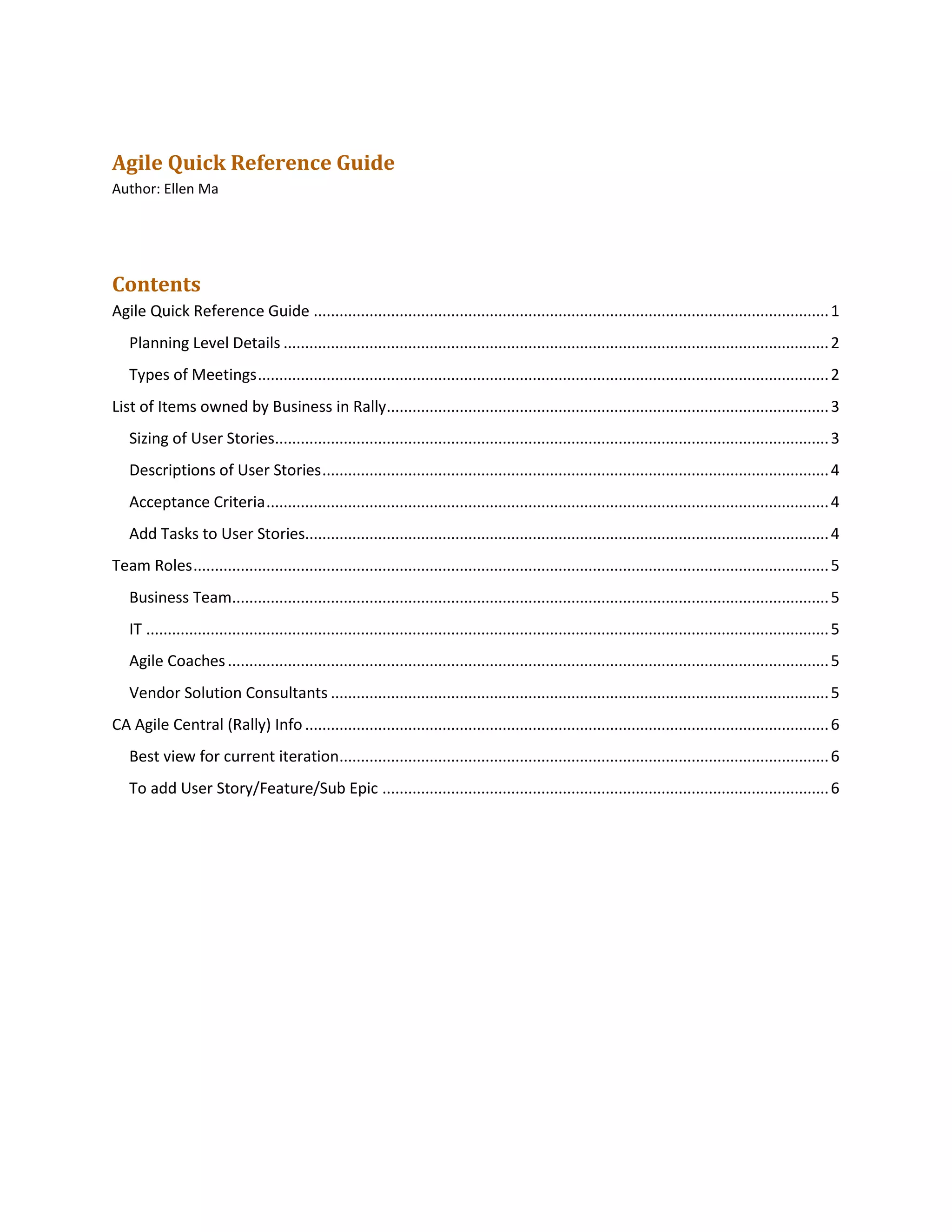 This document provides a quick reference guide for agile planning and processes. It describes meeting types and frequencies, user story sizing and descriptions, acceptance criteria, adding tasks, and team roles. It also provides information on navigating the CA Agile Central tool, including how to view the current iteration and add user stories, features, and epics.