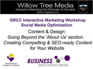 The document summarizes a workshop on social media optimization and content design for websites. The workshop covers building a website, determining goals and target audience, keyword research, website architecture, writing SEO-optimized content, using blogs, and designing for mobile technologies. It emphasizes starting with the user experience and focusing content on what users are looking for rather than just promoting the business. Examples of effective websites are reviewed.