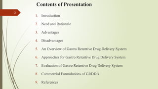 The document discusses gastro retentive drug delivery systems (GRDDS), which aim to prolong the retention time of oral drug formulations in the stomach to improve drug bioavailability and reduce dosing frequency. It outlines the advantages and disadvantages of GRDDS, various approaches for their development, and compares them with conventional drug delivery systems. The presentation, by Mr. Ravindra Popat Mali and Dr. Javesh Kashinath Patil, was part of the 4th International Online-Conference on Nanomaterials held in May 2023.