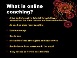 The document discusses an e-learning and online coaching program designed for GRE preparation, offering a 33-hour course conducted live via Skype with flexible timing and access to high-quality materials. It includes testimonials from successful students who achieved high scores due to personalized instruction and practical approaches to learning. The course covers various aspects of GRE testing, such as verbal and analytical writing, supported by extensive resources and practice materials.