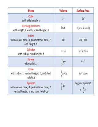 The document discusses different types of three-dimensional shapes studied in solid geometry. It provides definitions and examples of cubes, rectangular prisms, cylinders, spheres, cones, and pyramids. It also gives the formulas for calculating the volume and surface area of these shapes. For each shape, it provides examples of applying the formulas to solve volume and surface area problems.