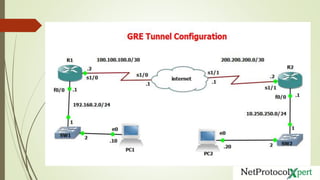 GRE is a tunneling protocol that encapsulates packets inside IP to transport traffic across an IP network. The document describes configuring GRE tunnels between routers R1 and R2 to connect their private networks and exchange routing information. This creates a virtual private link between R1 and R2 to pass traffic even though they are connected through the public internet. Interface configurations on R1, R2 and the internet router are provided to establish the GRE tunnels and associated routing.