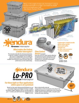 The document provides information about grease management solutions from Endura Interceptors, including: