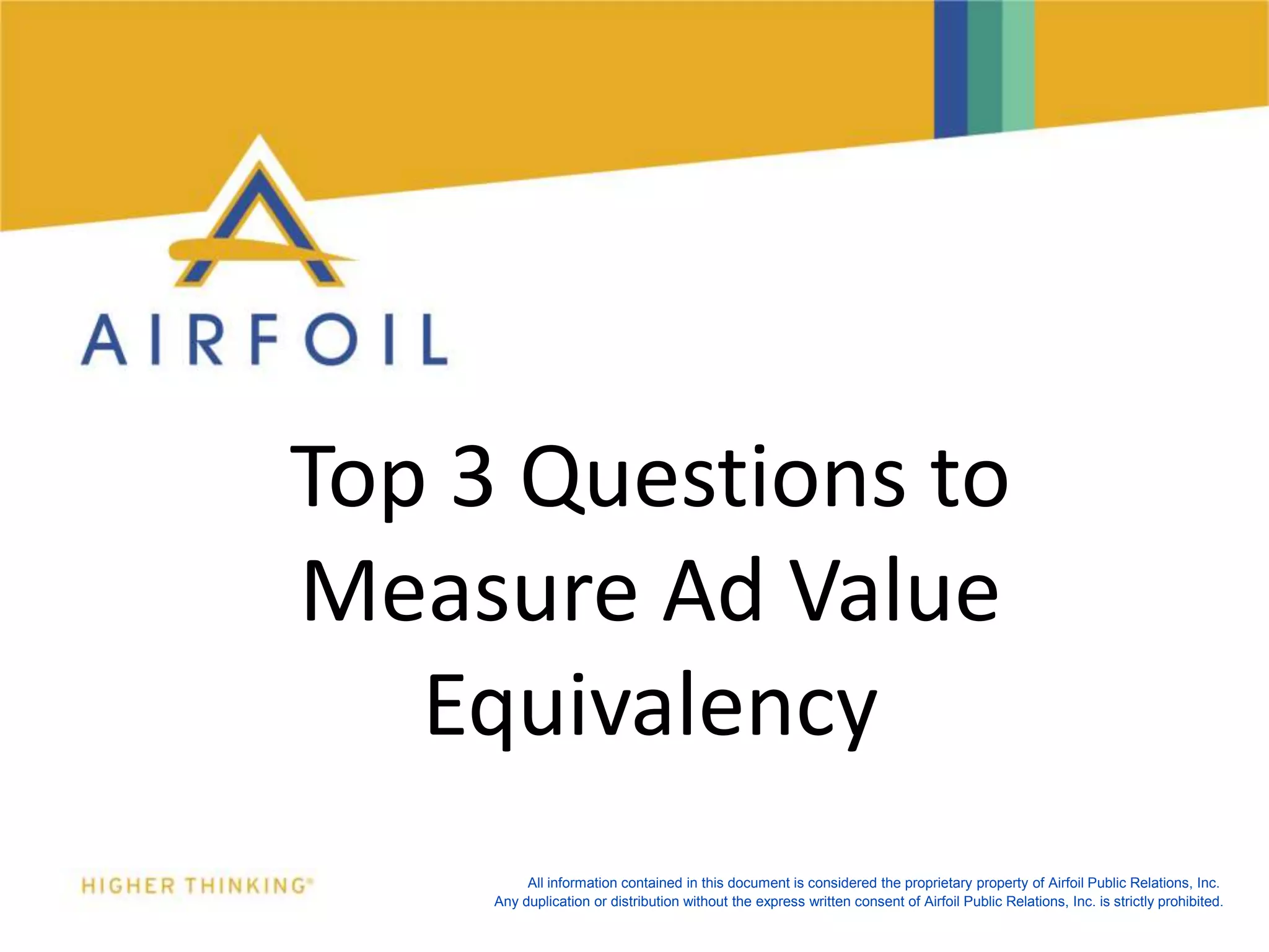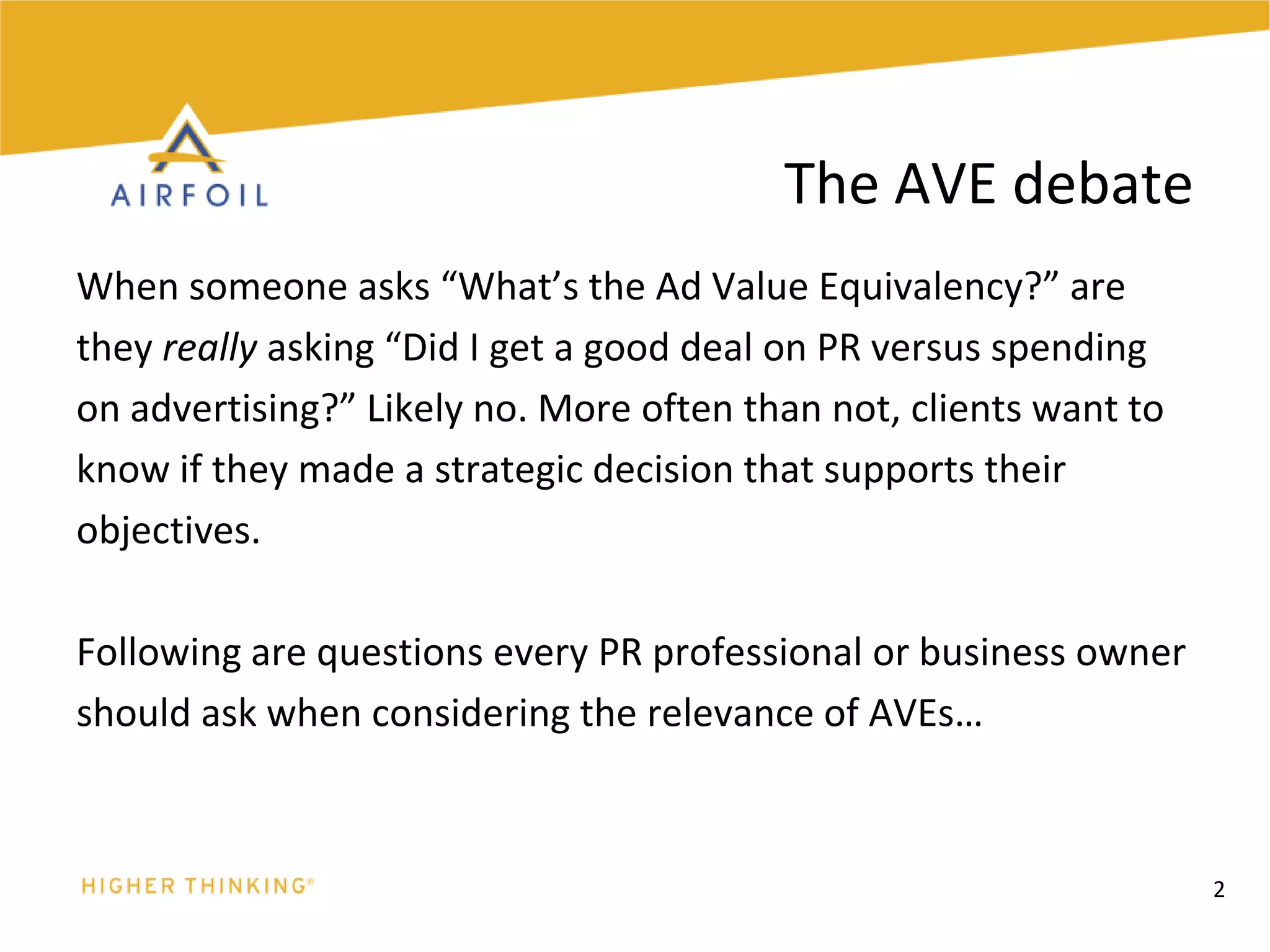 This document discusses questions that should be asked when evaluating public relations activity and measuring success, rather than solely relying on ad value equivalencies (AVEs). The three key questions are: 1) Is the AVE providing the most insightful, relevant information? 2) How do you know what customers are saying about you? 3) Are you the reason you don't know if your communications campaign is working? These questions get at whether objectives were defined and linked to business goals, if PR achieved its objectives, and how closely the PR plan is aligned with current goals and business performance. Relying only on AVEs is not considered the hallmark of success.