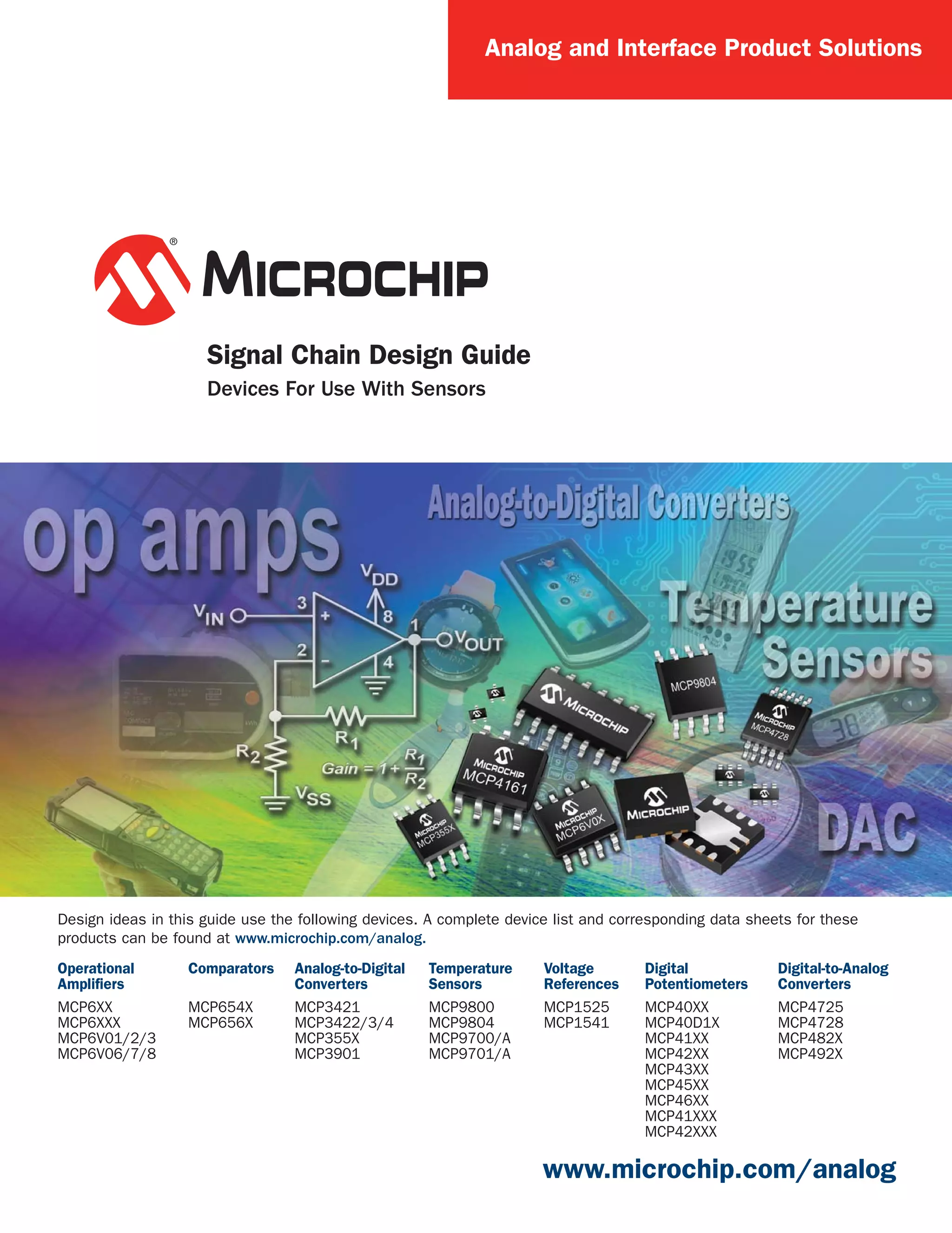 The document provides an overview of devices that can be used in sensor signal chains, including operational amplifiers, comparators, analog-to-digital converters, temperature sensors, voltage references, digital potentiometers, and digital-to-analog converters. It describes a typical sensor signal chain involving analog and digital domains, with sensors outputting low-level analog signals that are amplified, filtered, and converted to digital for processing by a microcontroller. The document lists common sensor types and phenomena they measure, like temperature, humidity, pressure, and their typical electrical outputs.