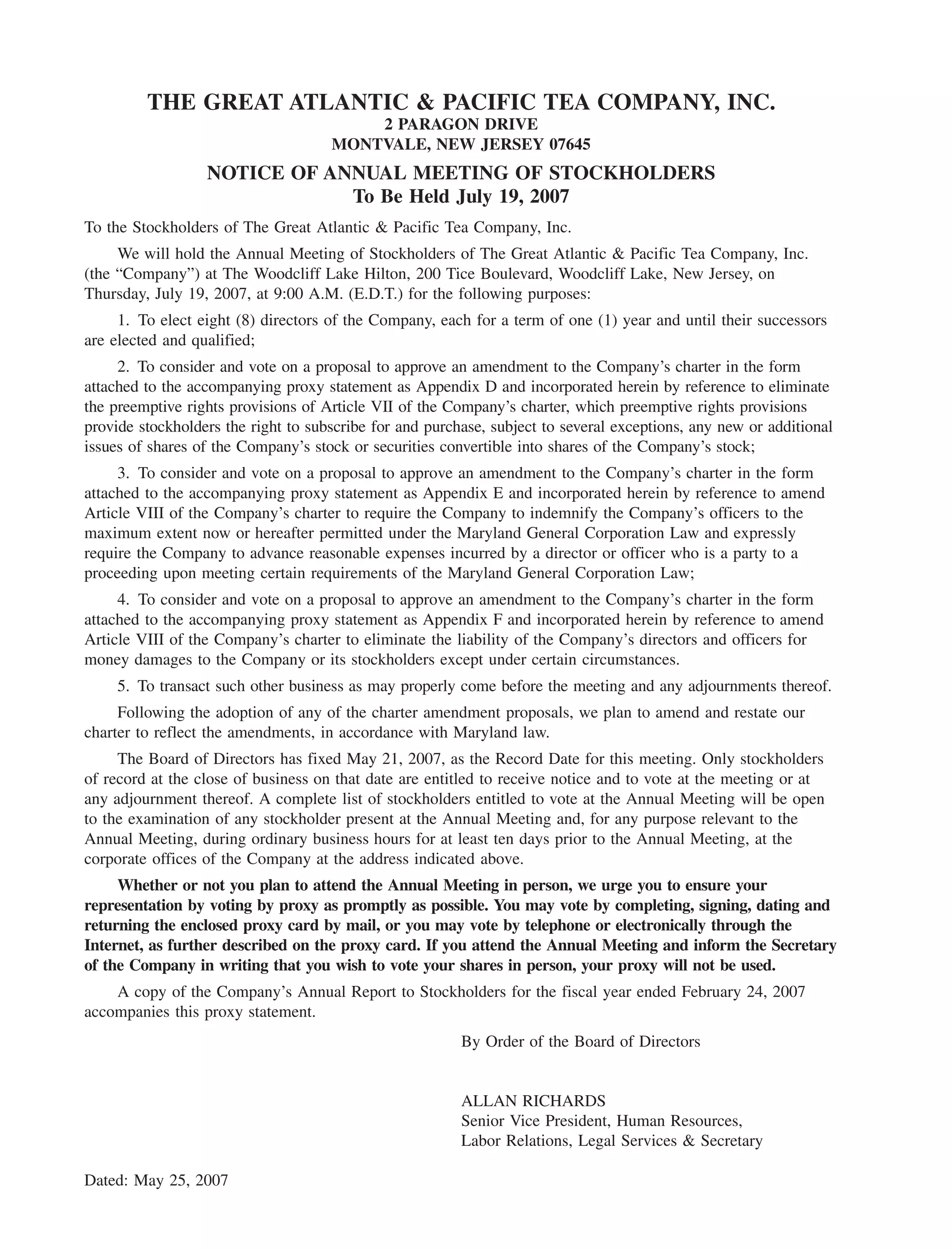 The document is a notice for the annual meeting of stockholders of The Great Atlantic & Pacific Tea Company, Inc. to be held on July 19, 2007. The purposes of the meeting are to elect eight directors, vote on proposals to amend the company's charter regarding preemptive rights, indemnification of officers, and limitation of liability of officers and directors. Stockholders of record as of May 21, 2007 are entitled to vote.