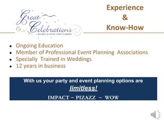 This document provides information about an event planning company that offers services for business events, social events, and dance lessons and shows. The company has over 12 years of experience in event planning and its staff have ongoing education and memberships in professional associations. They can plan and manage various types of events so clients can enjoy the celebrations.