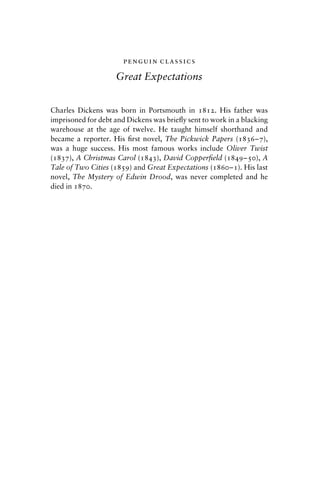 This document provides background information on Charles Dickens and his famous novel Great Expectations. It summarizes that Charles Dickens was born in 1812 in England and wrote many famous novels throughout his career, including Great Expectations published between 1860-1861. His last novel, The Mystery of Edwin Drood, was never completed as Dickens passed away in 1870. The document is the cover of a Penguin Classics edition of Great Expectations.