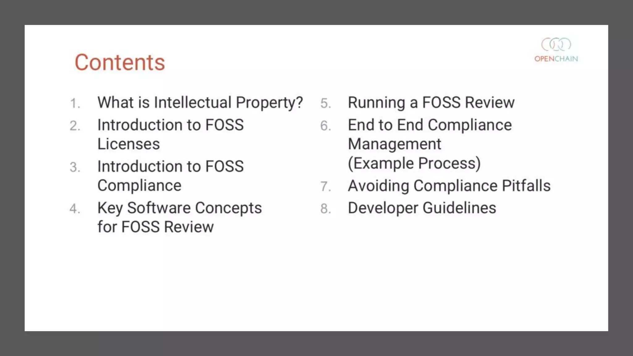 The OpenChain project, supported by the Linux Foundation, establishes a standardized compliance framework for organizations utilizing open source software. It offers flexible processes, self-certification options, and reference materials to aid firms in achieving conformance, promoting community engagement. Key developments include international partnerships, notable board member additions, and a move towards formal standardization.