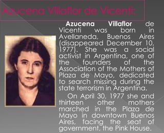 Azucena Villaflor de Vicenti was a social activist in Argentina and one of the founders of the Association of the Mothers of Plaza de Mayo, dedicated to searching for people who went missing during state terrorism in Argentina. On April 30, 1977, she and thirteen other mothers marched in Plaza de Mayo in Buenos Aires facing the government headquarters to seek information about their missing family members.