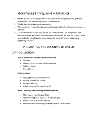 3. Successful speeches have a strong introduction that engages listeners, a well-structured body with limited main points, and a concise conclusion that leaves the audience with a clear takeaway message. Proper preparation and presentation skills can help any speaker impress audiences and overcome their fears.