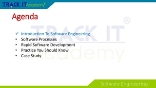 The document provides an overview of software engineering concepts including software processes, rapid software development, practices, and a case study on the V-Model process. It defines software and software engineering. It describes common software process models like waterfall, iterative development, and component-based development. It also covers rapid software development approaches like incremental delivery and agile methods. Key practices discussed include pair programming, prototyping, and activities in the software development lifecycle. Finally, it presents the phases of the V-Model process and how it maps testing to requirements and design.