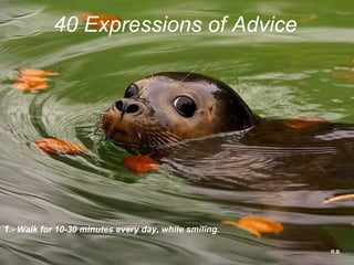 This document provides 40 pieces of advice on how to live a fulfilling life. Some of the key advice includes: walking for 10-30 minutes daily while smiling; sitting quietly for 10 minutes each day in isolation; upon waking say your goal for the day; listen to quality music daily for nourishment of the soul; play more games and read more books than the previous year; make at least 3 people laugh every day; don't dwell on rumors or things beyond your control but invest in the positive present.