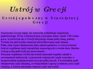 Ustrój w GrecjiUstrój społeczny w Starożytnej Grecji Starożytna Grecja nigdy nie stanowiła jednolitego organizmu państwowego. Wraz z intensywnym rozwojem miast, około VIII wieku p.n.e. wytworzyła się w Grecji instytucja zwana polis (mng. poleis). Termin ten pierwotnie oznaczał ufortyfikowaną część miasta. Polis, choć często tłumaczone jako miasto-państwo, w rzeczywistości była to wspólnota ludzi niezależnie stanowiących o swoim losie. Bardzo ważną cechą polis była jej suwerenność. Poczucie wspólnoty wśród obywateli umacniał wspólny udział w ceremoniach kultowych, wyprawach wojennych i nade wszystko w bezpośrednim podejmowaniu decyzji politycznych. Terytorialnie polis obejmowała część miejską, ze świątyniami i agorą (rynkiem) oraz część wiejską, w której mieszkała większa część obywateli.