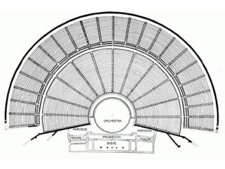 Teatr grecki –wywodzi się z tradycji obrzędów religijnych, zwłaszcza związanych z obchodami ku czci Dionizosa . Widowiska te musiały być łatwo dostępne dla ludności, pierwsze sztuki wystawiano więc na wytyczonym u stóp wzgórza placu zwanym orchestra , a na jego środku ustawiano ołtarz ( thymele ). Początkowo orchestra miała kształt zbliżony do prostokąta, koła albo elipsy, ostatecznie przyjął się kształt koła. Na placu (orchestrze) występował chór i odbywały się popisy taneczne, widzowie zasiadali na zboczu góry, początkowo bezpośrednio na ziemi, później na drewnianych ławkach. Tak powstała widownia w kształcie dużego (większego od półkola) wycinka koła, czyli theatron .