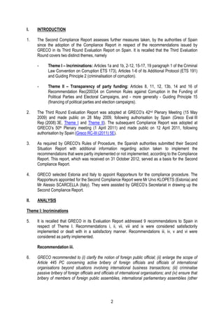 This document provides a summary of Spain's progress in implementing recommendations from GRECO (the Group of States Against Corruption) regarding transparency of political party funding and incriminations related to corruption. It finds that Spain has partly implemented recommendations regarding clarifying definitions related to foreign officials, criminalizing certain acts of bribery and trading of influence, and increasing transparency of political party loans. However, more work remains to fully implement recommendations regarding criminalizing bribery of foreign arbitrators and jurors and increasing sanctions and publicity requirements related to political party financing. The document was adopted by GRECO to assess Spain's implementation efforts.