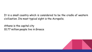 This document presents a project by 4th graders of the 10th Helioupolis Primary School about Greece, highlighting its significant cultural landmarks and geographical features. Greece, known as the cradle of Western civilization, has Athens as its capital and is rich in history with sites like the Acropolis and the ancient theater of Epidaurus. The document also shares personal reflections from students on their favorite locations and foods in Greece.