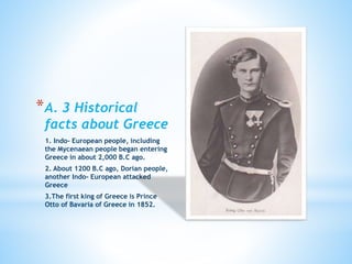 1) Around 2000 BC, Indo-European people including the Mycenaeans began entering Greece. In 1200 BC, the Dorian people attacked Greece. The first king of Greece was Otto of Bavaria in 1852.