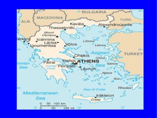 Greece borders several countries and is home to Mount Olympus. Athens is the capital city and Greek is the national language. Greece is significant as the birthplace of democracy, philosophy, the Olympic Games, and various forms of literature and mathematics. In ancient Greece, Athens and Sparta were the two dominant city-states that fought against the Persian Empire until Alexander the Great's conquest. Major sites of interest include the Acropolis in Athens with the Parthenon temple dedicated to Athena, as well as temples in Delphi and on islands like Santorini, Mykonos, and Rhodes. Traditional Greek cuisine features dishes like moussaka, stifado, Greek salad, souvlaki, feta cheese, and