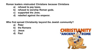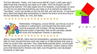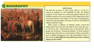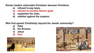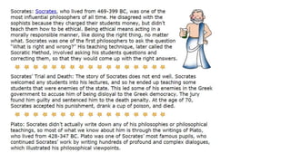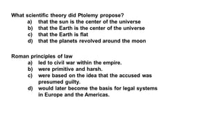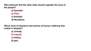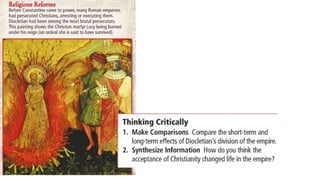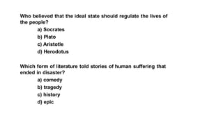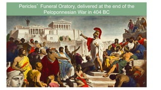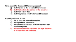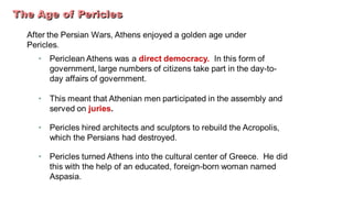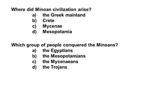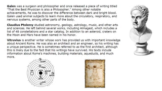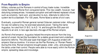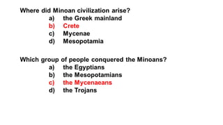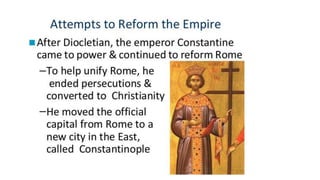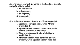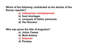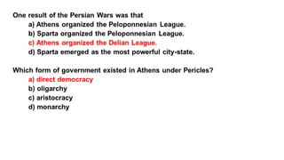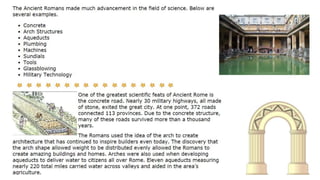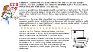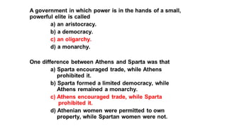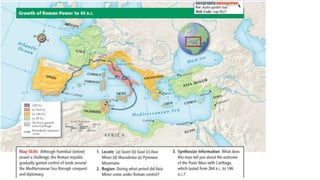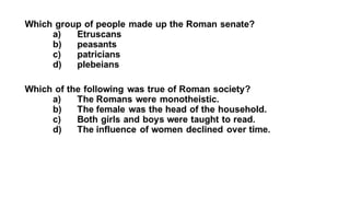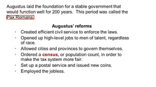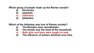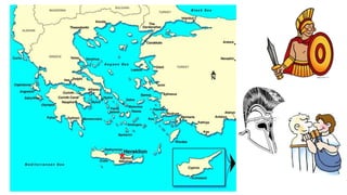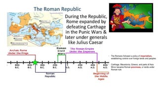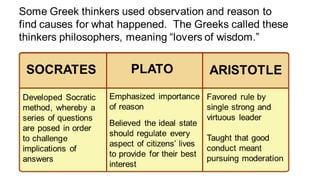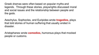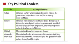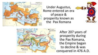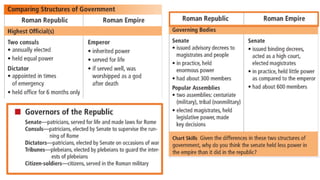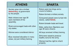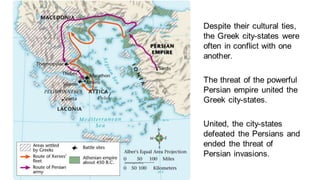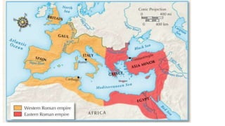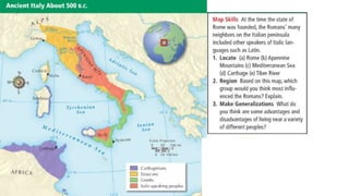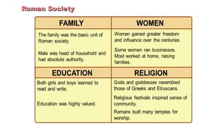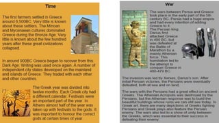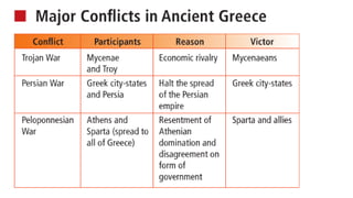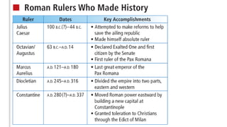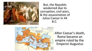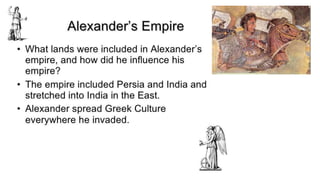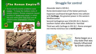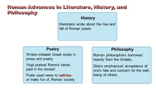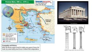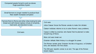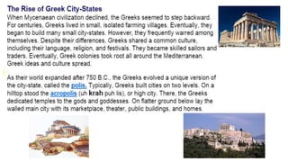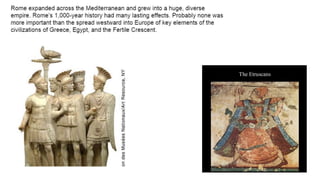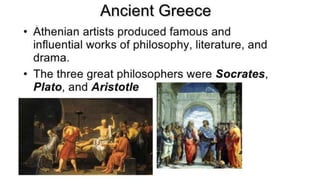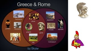 The document provides information on the differences between ancient Greek and Roman civilizations. It discusses differences in art styles, with Greeks favoring perfection and Romans realism. It also contrasts how the Greeks established colonies while the Romans built an empire through conquest. The Greeks created independent city-states while the Romans united a large territory under a central government. The Greeks spoke Greek and the Romans spoke Latin.
