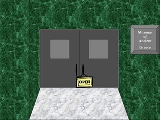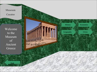 The document is a virtual museum about Ancient Greece created by Miss Wosczyna's class. It contains exhibits on various topics like history, geography, economics, and more. Students in the class wrote descriptions, provided images, and created content for the different exhibits to teach visitors about Ancient Greece's contributions and way of life.