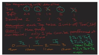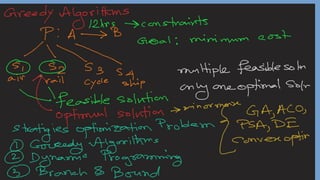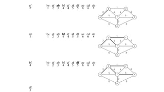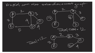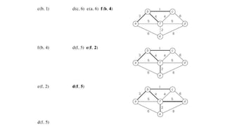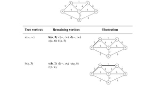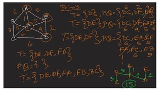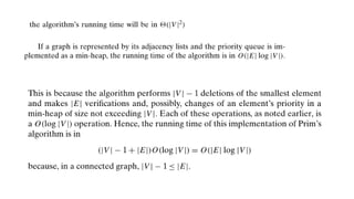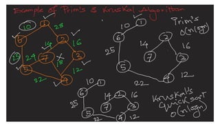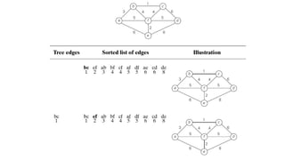 This document discusses greedy algorithms for minimum spanning trees and shortest paths. It describes Prim's and Kruskal's algorithms for finding minimum spanning trees in graphs, noting Kruskal's runs in O(|E| log |E|) time with an efficient sorting algorithm. It also mentions Dijkstra's algorithm for finding shortest paths in graphs with non-negative edge weights.