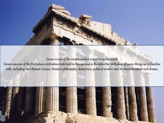 Greece is known for being the birthplace of Western civilization and for its diverse cultures influenced by its location between East and West. The climate and geography result in varied micro-climates across the country. Greek culture is deeply rooted in traditions and religious festivals, and Greeks take pride in their cultural customs and passionate national identity despite influences over history.